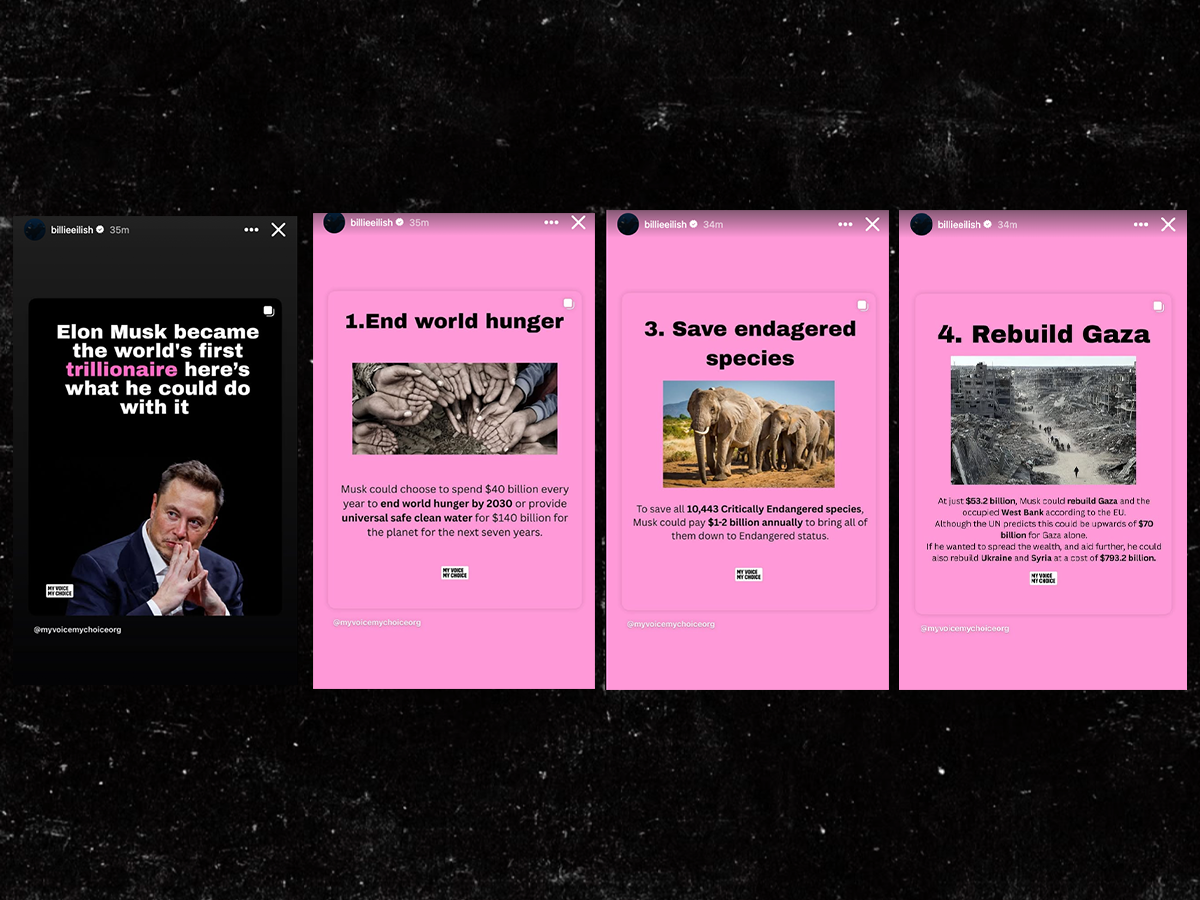 Η Μπίλι Άιλις κλιμακώνει την κριτική της απέναντι στους υπερ-πλούσιους, στοχοποιώντας αυτή τη φορά ευθέως τον Έλον Μασκ, καθώς ο δισεκατομμυριούχος επιχειρηματίας φέρεται να βρίσκεται σε τροχιά να γίνει ο πρώτος «τρισεκατομμυριούχος» στον κόσμο χάρη σε ένα γιγαντιαίο πακέτο αμοιβών από την Tesla. Σε σειρά από Instagram Stories, η 23χρονη τραγουδίστρια αναδημοσίευσε γραφήματα της καμπάνιας My Voice, My Choice, τα οποία περιέγραφαν υποθετικούς τρόπους με τους οποίους μια περιουσία ύψους 1 τρισ. δολαρίων θα μπορούσε να ανακατανεμηθεί υπέρ της ανθρωπότητας. Μεταξύ άλλων, τα σενάρια πρότειναν ετήσια συνεισφορά 40 δισ. δολαρίων έως το 2030 για την εξάλειψη της παγκόσμιας πείνας, επενδύσεις 140 δισ. δολαρίων τον χρόνο για επτά χρόνια ώστε να εξασφαλιστεί καθολική πρόσβαση σε ασφαλές πόσιμο νερό και κονδύλια 1–2 δισ. δολαρίων ετησίως για τη διάσωση πάνω από 10.000 ειδών που απειλούνται με εξαφάνιση.
