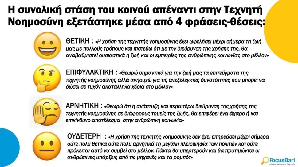 Ειδικότερα, σύμφωνα με τη νέα πανελλαδική έρευνα της Focus Bari, η οποία συστηματικά παρακολουθεί τη σχέση και τις απόψεις των Ελλήνων πολιτών σχετικά με την Τεχνητή Νοημοσύνη, διαπιστώνονται τα εξής συμπεράσματα: