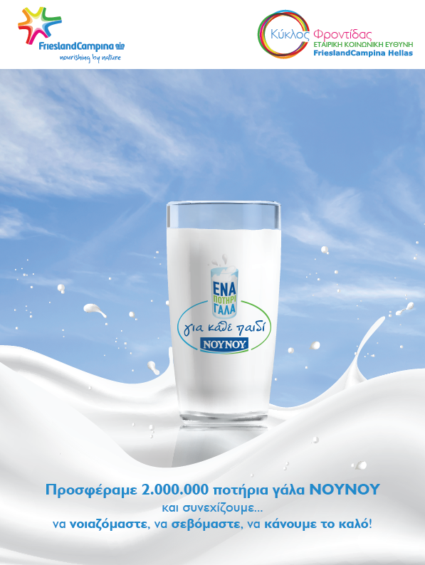 Βλέποντας στα πρόσωπα των παιδιών το αύριο, η FrieslandCampina Hellas αποδεικνύει έμπρακτα τη στήριξή της στην ελληνική κοινωνία και οικογένεια. Το «ΝΟΥΝΟΥ: Ένα Ποτήρι Γάλα για κάθε Παιδί!», αποτελεί αναπόσπαστο κομμάτι του ολιστικού προγράμματος Εταιρικής Κοινωνικής Ευθύνης «Κύκλος Φροντίδας», που αντανακλά τις αξίες της, τη φροντίδα, τον σεβασμό για το Παιδί και την Οικογένεια και σε παρακινεί να νοιάζεσαι, να σέβεσαι, να κάνεις το καλό αθόρυβα και ουσιαστικά.