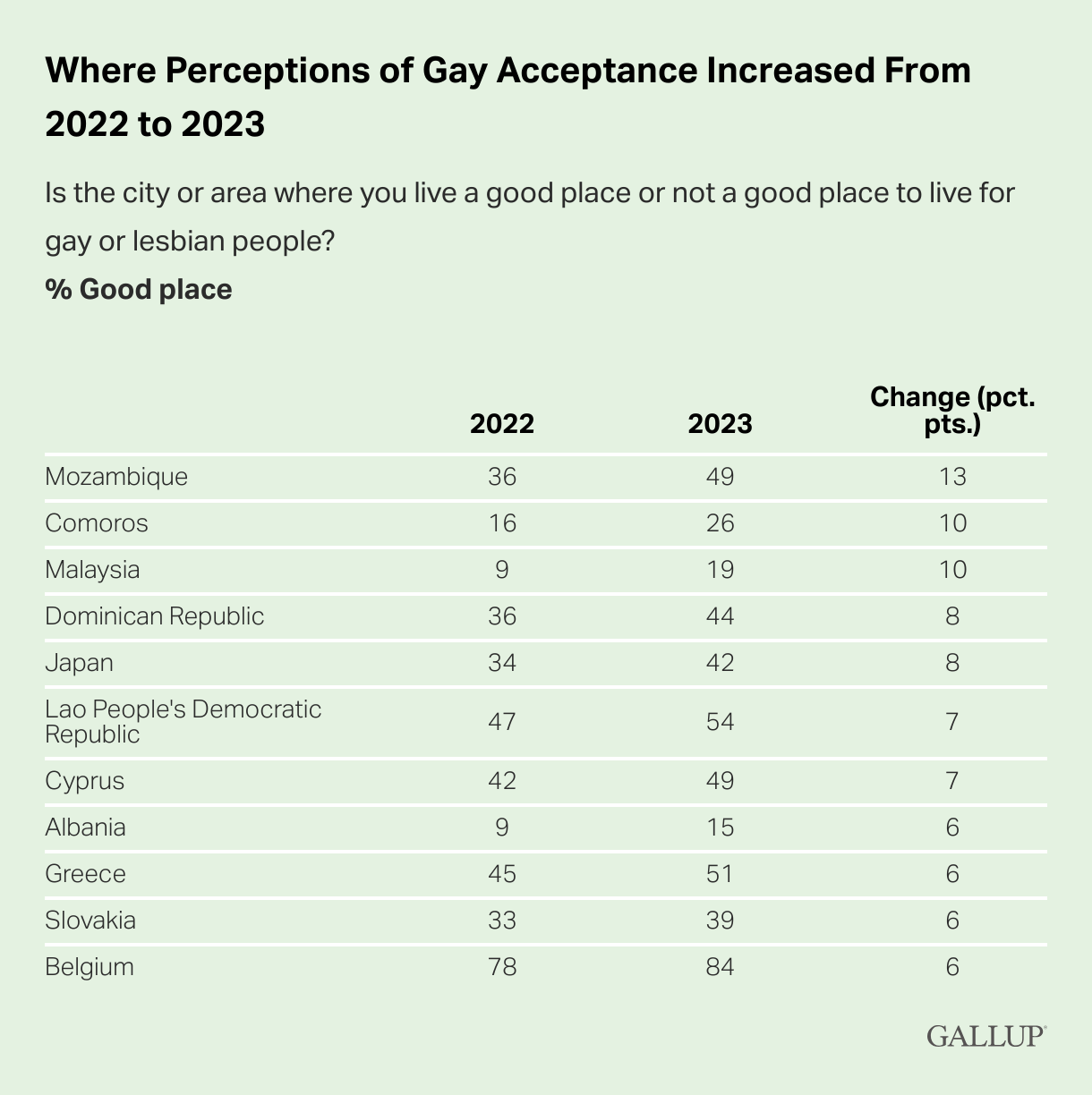 Σχεδόν οι μισοί άνθρωποι παγκοσμίως (45%) θεωρούν την πόλη ή την περιοχή τους «καλό μέρος» για να ζουν οι γκέι ή οι λεσβίες το 2023.Σχεδόν άλλοι τόσοι, το 44%, δήλωσαν ότι είναι «όχι καλό μέρος».