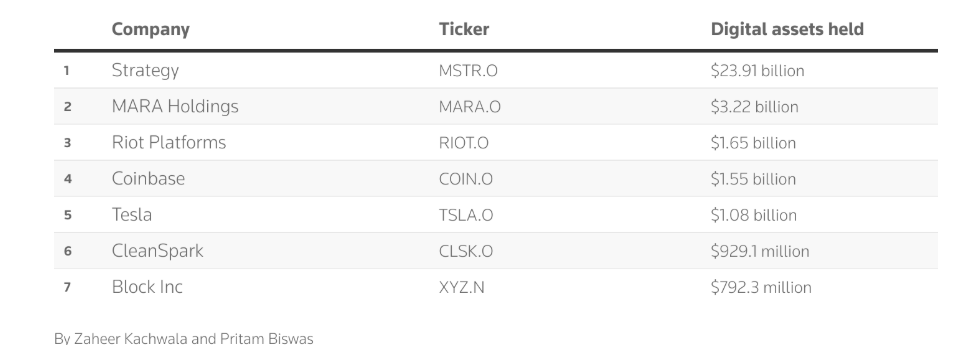 Ακολουθεί ένας κατάλογος των εταιρειών στις Ηνωμένες Πολιτείες που έχουν bitcoin και άλλα ψηφιακά νομίσματα στον ισολογισμό τους στις 31 Δεκεμβρίου 2024.