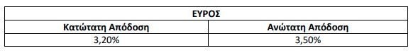 Το εύρος απόδοσης, το οποίο καθορίστηκε από τους Συντονιστές Κύριους Αναδόχους και εντός του οποίου οι Ειδικοί Επενδυτές θα υποβάλλουν τις αιτήσεις κάλυψης Ομολογιών (εφεξής οι «Αιτήσεις Κάλυψης»), είναι το ακόλουθο: