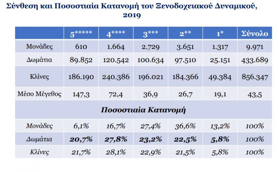 Ειδικότερα, σύμφωνα με την έρευνα του ΙΤΕΠ οι μονάδες πέντε αστέρων της χώρας μας έφτασαν τις 610 το 2019 (89.852 δωμάτια και 186.190 κλίνες) καλύπτοντας το 6,1% του συνολικού ξενοδοχειακού δυναμικού της χώρας. Αντιστοίχως τα τετράστερα έφτασαν τις 1.664 μονάδες, προσφέροντας 150.542 δωμάτια και 240.386 κλίνες στους επισκέπτες των διαφόρων προορισμών της χώρας. Περί τα 2.729 ήταν το προηγούμενο έτος τα ξενοδοχεία τριών αστέρων, προσφέροντας 100.634 δωμάτια και 196.021 κλίνες ενώ οι μονάδες δύο αστέρων και ενός αστεριού έφτασαν τις 3.651 (97.510 δωμάτια και 184.366 κλίνες) και τις 1.317 (24.151 δωμάτια και 49.384 κλίνες) αντίστοιχα.