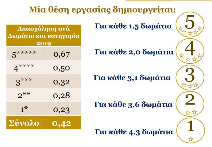 Ταυτόχρονα τα πεντάστερα ξενοδοχεία είναι τροφοδότης και της απασχόλησης, αν σκεφτεί κανείς ότι για κάθε 1,5 δωμάτιο πεντάστερου ξενοδοχείου που εγκαινιάζεται δημιουργείται μια θέση εργασίας, σε αντίθεση για παράδειγμα με τα ξενοδοχεία 1 αστεριού από τα οποία προκύπτει μια θέση εργασίας για κάθε 4,3 δωμάτια. Το αντίστοιχο ποσοστό στις λοιπές κατηγορίες διαμορφώνεται ως εξής: μια θέση εργασίας για κάθε 2 δωμάτια στα τετράστερα, μια θέση εργασίας για κάθε 3,1 δωμάτια στα ξενοδοχεία τριών αστέρων και μια θέση εργασίας για κάθε 3,6 δωμάτια στα ξενοδοχεία δύο αστέρων.