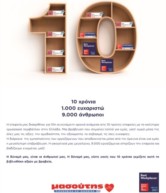 Για 10η συνεχή χρονιά η εταιρεία Μασούτης, ανάμεσα στις κορυφαίες εταιρείες με το καλύτερο περιβάλλον εργασίας στην Ελλάδα