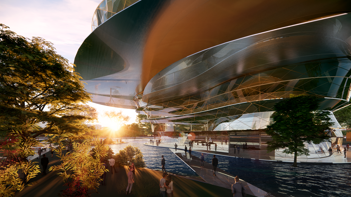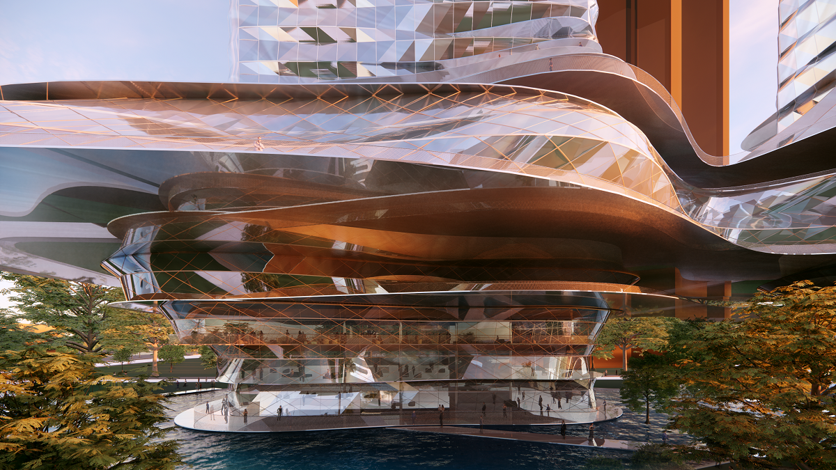 Επίσης προσπαθεί να μας εξηγήσει ποια είναι η δικιά του οπτική, ως ιδρυτή κι επικεφαλής του γραφείου, για τη σύνθεση και την κατασκευή ουρανοξυστών που έχει αναλάβει να υλοποιήσει στην Κίνα: “Πρόθεση μας είναι να διασπάσουμε την ψυχρότητα και την συμπαγή, μονολιθική αντιμετώπιση του ουρανοξύστη και να δώσουμε την μορφή και λειτουργία ενός ζωντανού οργανισμού. Σε αυτό το έργο εξερευνούμε οργανικά σχήματα και καμπύλες εμπνευσμένες από τους κυματισμούς του νερού, με την χρήση γυαλιού που αντανακλά έντονα το εξωτερικό περιβάλλον, τον ουρανό και το γειτονικό ποτάμι. Το αποτέλεσμα δίνει μια αίσθηση ρευστότητας και φυσικής κίνησης, με τους ουρανοξύστες να φαίνονται σαν ένα μέρος του φυσικού τοπίου αντί για αυστηρές και στερεές δομές”.