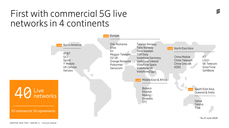 Η Ericsson αποτελεί ηγετική εταρεία τεχνολογίας 5G, όπως αποδεικνύεται και από το ότι είμαστε εκείνοι που προμηθεύσαμε με υποδομές τα πρώτα ζωντανά εμπορικά δίκτυα 5G σε τέσσερις ηπείρους, ενώ ήδη έχουμε 93 εμπορικές συμφωνίες με ισάριθμους παρόχους ανά τον κόσμο, 40 εκ των οποίων έχουν ήδη λανσάρει εμπορικά το 5G.