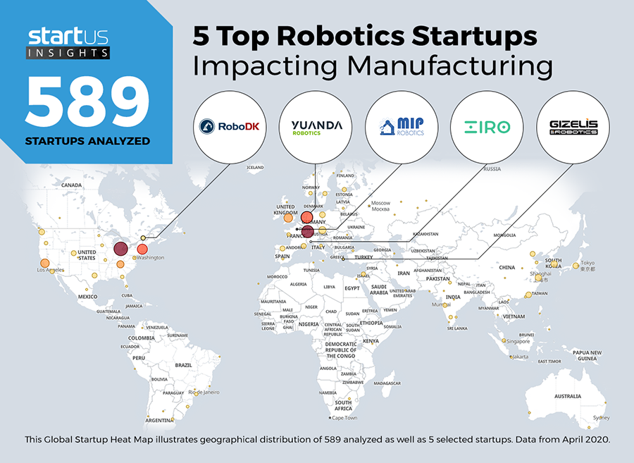 Ακολουθεί ο παγκόσμιος χάρτης Global Startup Heat Map της StartUs Insights απεικονίζει τις 5 νεοσύστατες και αναδυόμενες εταιρείες που αναπτύσσουν λύσεις ρομποτικής.