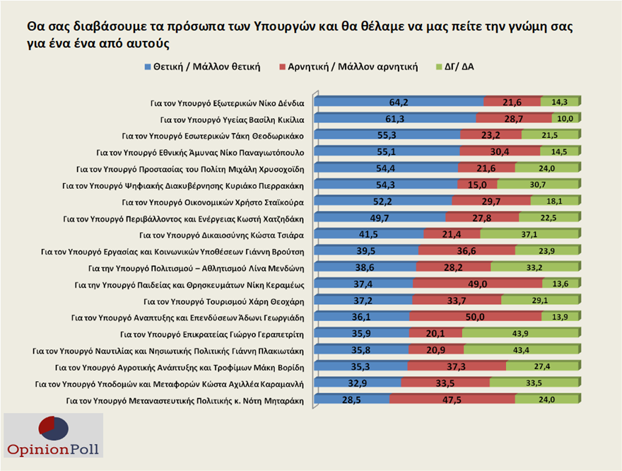 Στην πρώτη τριάδα των Υπουργών για τους οποίους έχουν θετική άποψη βρίσκονται οι Νίκος Δένδιας, Βασίλης Κικίλιας και Τάκης Θεοδωρικάκος. Την δεκάδα συμπληρώνουν οι Υπουργοί Νίκος Παναγιωτόπουλος, Μιχάλης Χρυσοχοίδης, Κυριάκος Πιερρακάκης, Χρήστος Σταικούρας, Κωστής Χατζηδάκης, Κώστας Τσιάρας και Γιάννης Βρούτσης.