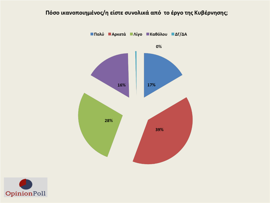Το 56% δηλώνει ικανοποιημένο συνολικά από το έργο της Κυβέρνησης (62% τον Ιούλιο). Αν και σημειώνεται αυτή η πτώση, φαίνεται ότι θετική άποψη έχει το 30.9% των ψηφοφόρων του ΣΥΡΙΖΑ και το 73.7% των ψηφοφόρων του ΚΙΝΑΛ. Ανάμεσα στους ψηφοφόρους της Ν.Δ ικανοποιημένο δηλώνει το 82.4%.