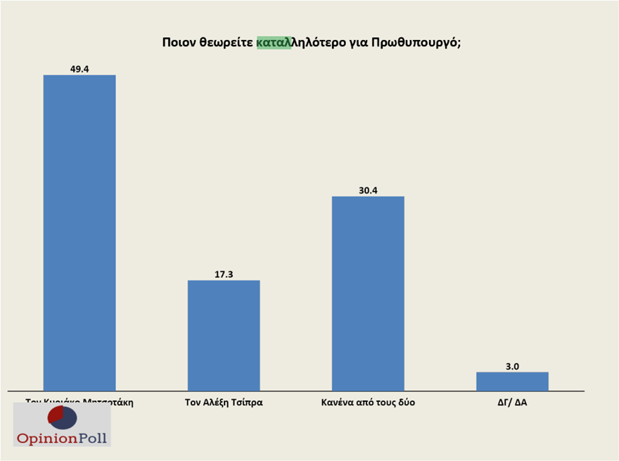 Ο Κυριάκος Μητσοτάκης προηγείται κατά 32.1% της καταλληλότητας για πρωθυπουργός συγκεντρώνοντας το 49.4% (52.7% τον Σεπτέμβριο) των προτιμήσεων, έναντι 17.3% του Αλέξη Τσίπρα (19.4% τον Σεπτέμβριο).