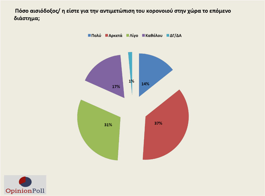 – Το 51% δηλώνει πολύ και αρκετά αισιόδοξο για την αντιμετώπιση του κορωνοϊού στο επόμενο διάστημα έναντι ενός 48% που δηλώνει λίγο ή καθόλου – υπάρχει εντυπωσιακή ισορροπία στο μέτωπο αυτό. Πάντως το 67% δηλώνει ικανοποιημένο από τον τρόπο που έχει χειριστεί την πανδημία συνολικά η Κυβέρνηση (70% τον Σεπτέμβριο).