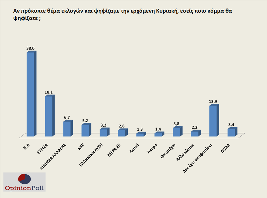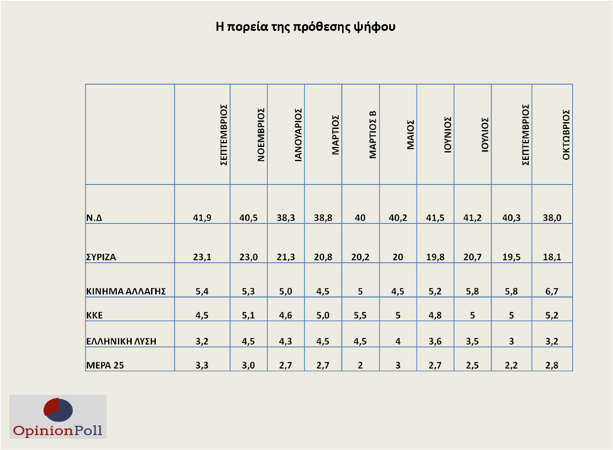 Η Ν.Δ συγκεντρώνει το 38% των προτιμήσεων στην πρόθεση ψήφου, αλλά παρά την πτώση κατά 2.3% κρατάει ισχυρό προβάδισμα της τάξης του 19.9% (21.2 % τον Σεπτέμβριο) γιατί ο ΣΥΡΙΖΑ σημειώνει πτώση 1.4%, καταγράφοντας ιστορικό χαμηλό στις έρευνες από τις περυσινές εκλογές, με 18.1%! Αυτή η πτώση του ΣΥΡΙΖΑ οφείλεται και στην πτώση του Α. Τσίπρα στην καταλληλότητα για Πρωθυπουργός , αλλά και στο γεγονός ότι μόλις το 13% δηλώνει ικανοποιημένο από τον τρόπο που ασκεί αντιπολίτευση. Μάλιστα το 69.1% των ψηφοφόρων του ΣΥΡΙΖΑ δηλώνει λίγο ή καθόλου ικανοποιημένο από τον τρόπο που ασκεί αντιπολίτευση.