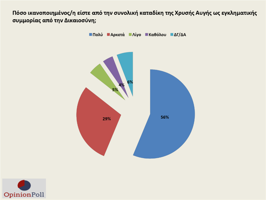 – Το 85% δηλώνει ικανοποιημένο από την συνολική καταδίκη της ΧΡΥΣΗΣ ΑΥΓΗΣ ως εγκληματικής συμμορίας. Υπάρχει ένα 9% που δηλώνει λίγο και καθόλου ικανοποιημένο.