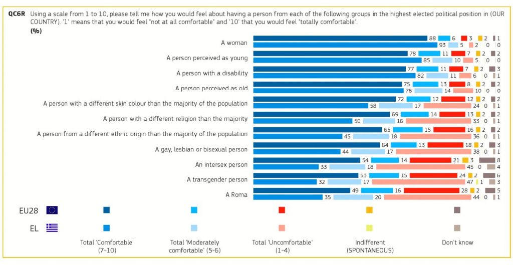 Μία από τις ερωτήσεις της έρευνας ήταν πως θα αισθάνονταν εάν ένα μέλος των διαφορετικών ομάδων αναλάμβανε το ανώτατο πολιτικό αξίωμα της χώρας τους. Οι Έλληνες απάντησαν σε ποσοστό 28% απάντησαν ότι θα ήταν εντελώς άβολο γι’ αυτούς να εκλεγεί ένας Ρομά πρωθυπουργός, ενώ το 49% πολύ άνετα. Το 24% δήλωσε ότι δεν θα ήταν καθόλου άνετα με έναν τρανσέξουαλ πρωθυπουργό και το 53% πολύ άνετα.