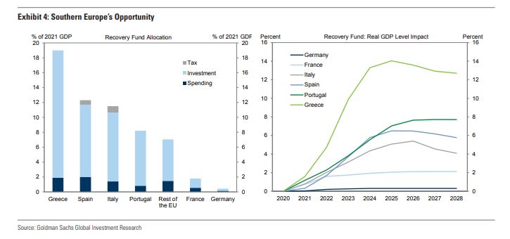 Όπως αναφέρει η Goldman Sachs, παρά το γεγονός ότι ελλοχεύουν σοβαροί κίνδυνοι που σχετίζονται με την εφαρμογή των προγραμμάτων στήριξης, σύμφωνα με τις εκτιμήσεις της, το ΑΕΠ σε Ιταλία και Ισπανία θα εκτιναχθεί πάνω από 5% μέχρι το 2026, ενώ η Ελλάδα και η Πορτογαλία θα έχουν ακόμα μεγαλύτερη μεγέθυνση. Στον αντίποδα, το Ταμείο Ανάκαμψης είναι λιγότερο σημαντικό για την Γαλλία, καθώς για αυτή προβλέπεται μικρότερη οικονομική βοήθεια.