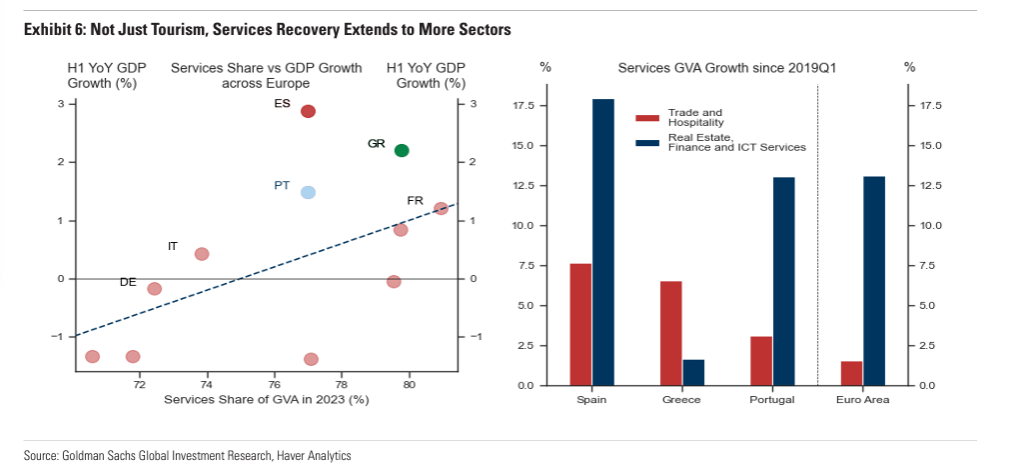 Σύμφωνα με την Goldman Sachs, η ανάκαμψη μετά την πανδημία στις οικονομίες αυτές συχνά εξηγείται από την ώθηση που δίνει ο Τουρισμός. Παρότι η αύξησή του έχει συμβάλει στην ανάπτυξη, η αναβίωση της δραστηριότητας στις υπηρεσίες έχει επεκταθεί πέρα από τον παραδοσιακό τομέα, με τον μέσο ρυθμό ανάπτυξης των υπηρεσιών υψηλής αξίας (ακίνητα, χρηματοοικονομικές υπηρεσίες και τεχνολογία πληροφορικής και επικοινωνιών) να είναι σχεδόν διπλάσιος από αυτόν των υπηρεσιών ταξιδιών και φιλοξενίας – αν και η Ελλάδα αποτελεί εξαίρεση σε αυτή την τάση.