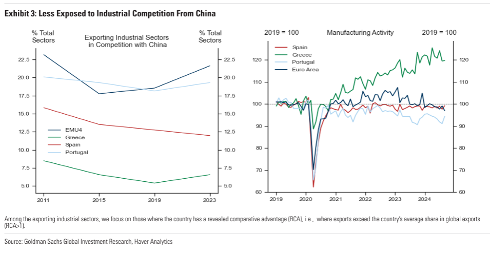 Η σχετικά χαμηλότερη έκθεση στους δασμούς των ΗΠΑ και στον κινεζικό βιομηχανικό ανταγωνισμό στις οικονομίες της Ισπανίας, της Πορτογαλίας και της Ελλάδας έχει διευκολύνει τη σχετικά πιο ανθεκτική μεταποιητική δραστηριότητα, με εξαίρεση την Πορτογαλία. Το πιο εντυπωσιακό παράδειγμα είναι η Ελλάδα, όπου η μεταποιητική δραστηριότητα είναι πλέον 20% πάνω από το επίπεδο του 2019 και ο ανταγωνισμός από τα κινεζικά βιομηχανικά προϊόντα είναι ο χαμηλότερος μεταξύ των τριών χωρών.