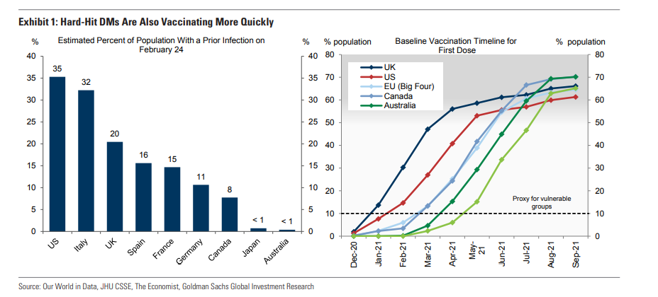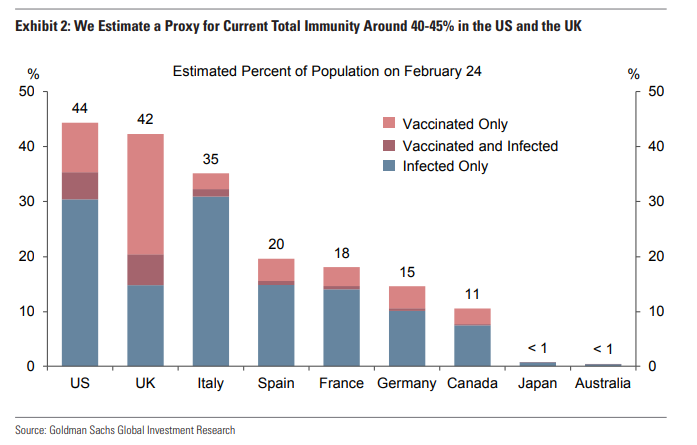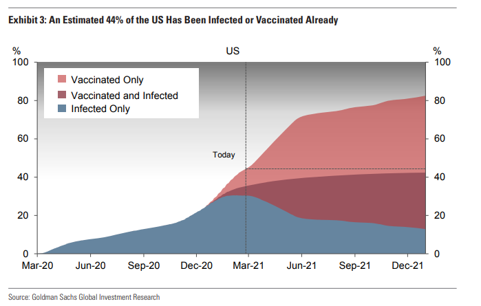 Σύμφωνα με την Goldman Sachs, η επιτάχυνση των εμβολιασμών θα οδηγήσει στην αύξησης της ανοσίας από 44% σήμερα σε 55% έως τα τέλη Μαρτίου και 60-65% έως τα τέλη Απριλίου. Στη συνέχεια, ο ρυθμός επίτευξης ανοσίας στον πληθυσμό των ανεπτυγμένων οικονομιών θα σημειώσει επιβράδυνση όπως και η ζήτηση για εμβόλια, με το 75% των πολιτών να παρουσιάζουν ανοσία έως τα τέλη Ιουνίου και περίπου 80% έως τα τέλη του 2021.