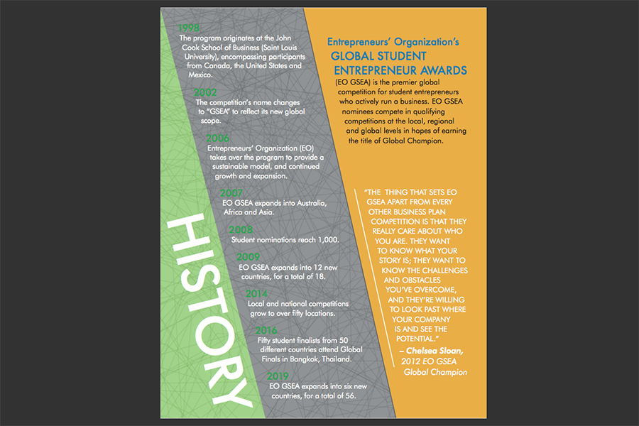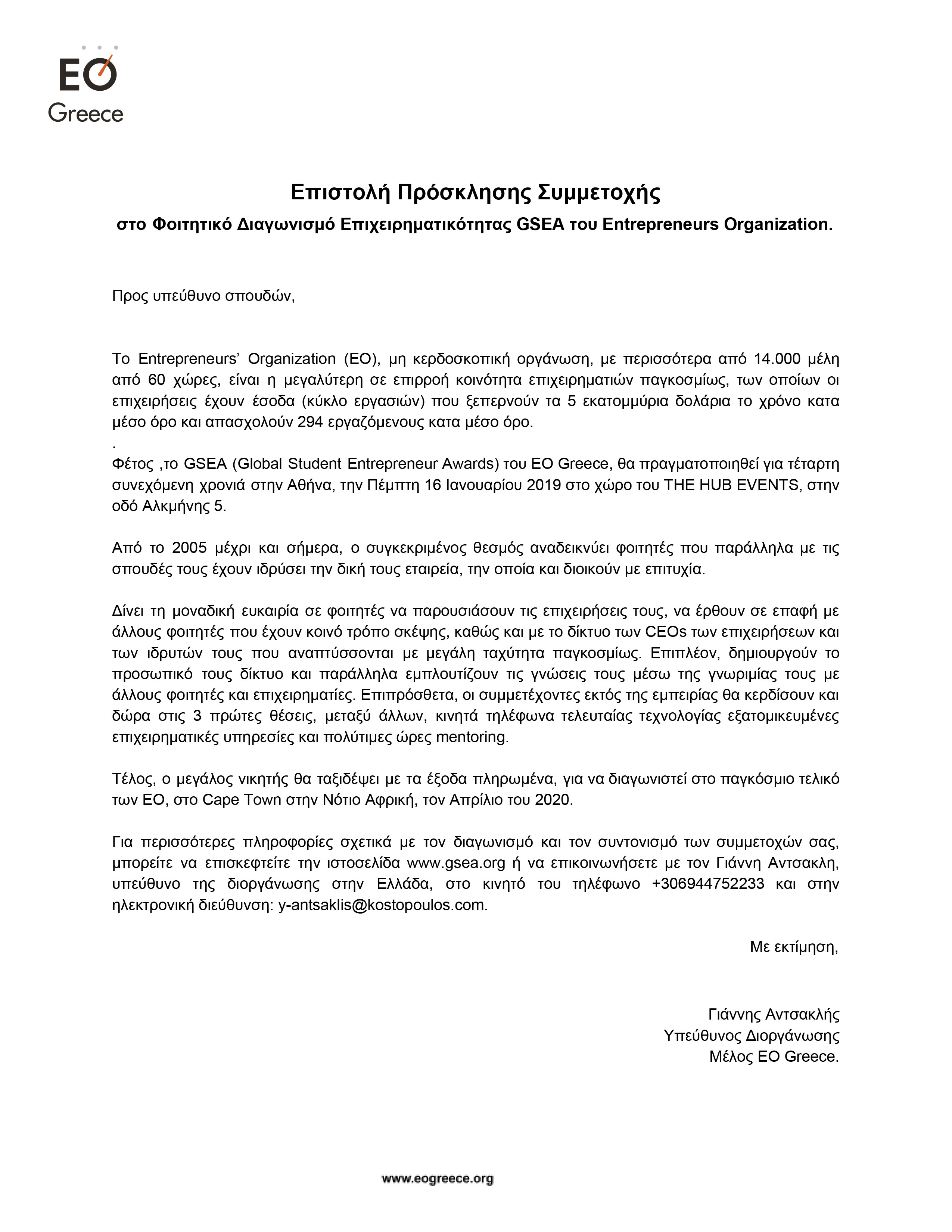 Για τέταρτη συνεχόμενη χρονιά πραγματοποιούνται στην Ελλάδα τα Global Student Entrepreneur Awards του Entrepreneurs’ Organization. Πρόκειται για έναν παγκόσμιο διαγωνισμό που δίνει την ευκαιρία στους φοιτητές-επιχειρηματίες να επικοινωνήσουν την εταιρεία τους, να έρθουν σε επαφή με άλλους φοιτητές, αλλά το πιο σημαντικό να αποκτήσουν ένα δυνατό networking γνωρίζοντας πολλούς CEOs και ιδρυτές άλλων εταιρειών.