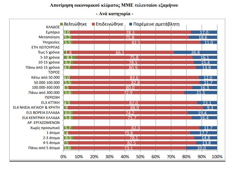 - 8 στις 10 επιχειρήσεις δήλωσαν πως η οικονομική κατάσταση της επιχείρησης τους επιδεινώθηκε κατά το προηγούμενο εξάμηνο έναντι μόλις 4,9% που δήλωσε ότι βελτιώθηκε και 15,1% που δήλωσε πως παρέμεινε αμετάβλητη