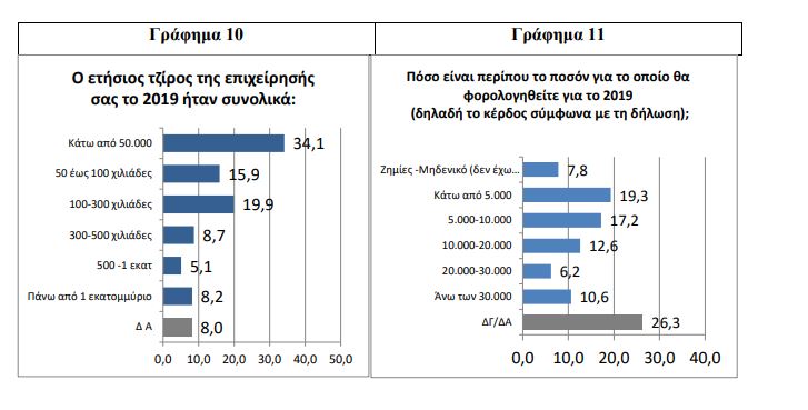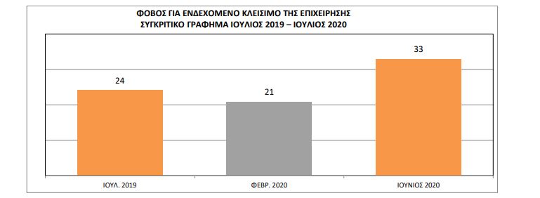 «Όλοι οι δείκτες οικονομικού κλίματος καταγράφουν σοβαρή μείωση δείχνοντας πως μέσα σε ελάχιστο χρονικό διάστημα η κατάσταση των μικρών και πολύ επιχειρήσεων έχει επιδεινωθεί δραματικά, θέτοντας σε κίνδυνο την βιωσιμότητα τους. Η ραγδαία μείωση της οικονομικής δραστηριότητας αρχίζει εκ νέου να αποτυπώνεται και στην αδυναμία καταβολής των υποχρεώσεων τόσο προς τον δημόσιο όσο και προς τους ιδιώτες. Ο φαύλος κύκλος ύφεσης – υπερχρέωσης φαίνεται πως αναβιώνει. Μέσα σε ένα τόσο τοξικό για τις επιχειρήσεις περιβάλλον, όπου δημιουργούνται συνθήκες για εκτεταμένο και μαζικό κλείσιμο μικρών και πολύ μικρών επιχειρήσεων που αποτελούν τον βασικό πυλώνα απασχόλησης στην Ελλάδα, είναι μάλλον αμφίβολο πως η ύφεση στην οποία ήδη έχει εισέλθει η ελληνική οικονομία θα είναι βραχύβια, ανεξάρτητα από τις προσπάθειες που καταβάλλονται από τους επιστήμονες της υγείας για την αποτελεσματική αντιμετώπιση του COVID-19. Η αποψίλωση των μικρών και πολύ μικρών επιχειρήσεων ισοδυναμεί με αποψίλωση της εναπομείνασας από την δεκαετή οικονομική κρίση μεσαίας τάξης θέτοντας σε σοβαρό κίνδυνο την διατήρηση της κοινωνικής συνοχής», σημειώνεται στην έρευνα.