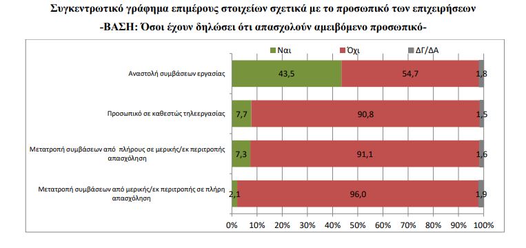 - 1 στις 6 των επιχειρήσεων που απασχολούν προσωπικό προχώρησαν σε μείωση των θέσεων απασχόλησης κατά το προηγούμενο εξάμηνο. Με βάση τα στοιχεία της έρευνας εκτιμάται ότι το προηγούμενο εξάμηνο χάθηκαν 117.000 θέσεις απασχόλησης.