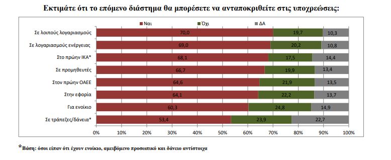 - 1 στις 4 επιχειρήσεις έχει ληξιπρόθεσμες οφειλές σε λογαριασμούς ενέργειας (ΔΕΗ, φυσικό αέριο), ενώ 1 στις 5 έχει ληξιπρόθεσμες οφειλές σε λοιπούς λογαριασμούς (τηλέφωνο, ύδρευση).