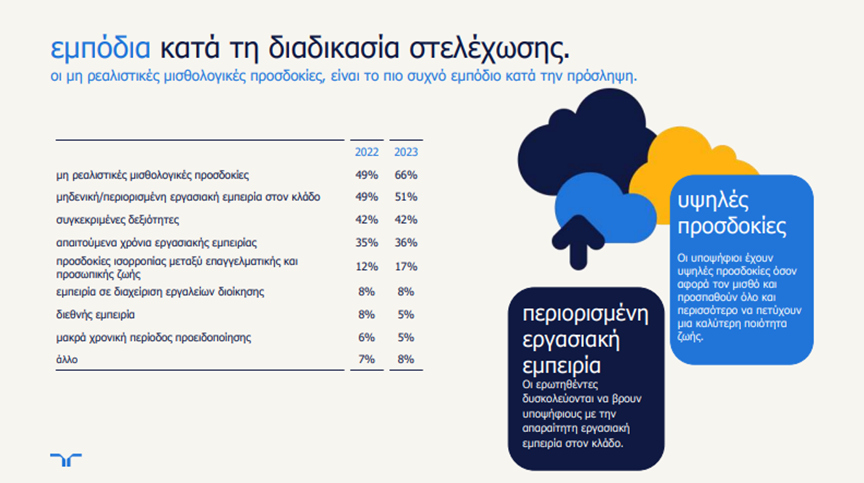 Βασική δυσκολία για την κάλυψη των θέσεων εργασίας σήμερα αποτελούν οι μη ρεαλιστικές μισθολογικές προσδοκίες των εργαζομένων, σύμφωνα με το 66% των επιχειρήσεων, ποσοστό που μάλιστα αυξήθηκε κατά 17 ποσοστιαίες μονάδες σε σχέση με το 2022. Το υψηλό κόστος διαβίωσης και η συνολική ανάγκη των εργαζομένων, κάθε γενιάς, για μια καλύτερη ποιότητα ζωής έχει οδηγήσει τους υποψήφιους στην αναζήτηση θέσεων εργασίας με αυξημένες μισθολογικές απαιτήσεις, οι οποίες σε αρκετές περιπτώσεις είναι μη ρεαλιστικές και αποτελούν ανασταλτικό παράγοντα στην εξέλιξη της επαγγελματικής τους διαδρομής.