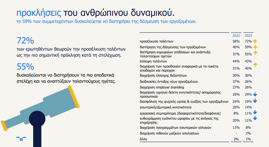 Σημαντικό στοιχείο που προκύπτει από την έρευνα είναι ότι οι επιχειρήσεις αδυνατούν να εντοπίσουν τα κατάλληλα άτομα, για να ικανοποιήσουν τις ανάγκες τους και για τον λόγο αυτό, η πρόσληψη του κατάλληλου ανθρώπινου δυναμικού είναι μία από τις πιο κομβικές ενέργειες, στις οποίες εστιάζουν οι εταιρείες στη σύγχρονη αγορά εργασίας. Για το 72% των ερωτηθέντων, η προσέλκυση κορυφαίων ταλέντων αποτελεί την πιο σημαντική πρόκληση κατά τη διαδικασία στελέχωσης ενώ η δυσκολία διατήρησης τόσο της δέσμευσης των εργαζομένων (59%) όσο και της ανάπτυξης ταλαντούχων ηγετικών στελεχών με κορυφαίες επιδόσεις (55%), φέρνει τις επιχειρήσεις αντιμέτωπες με σημαντικά εμπόδια.