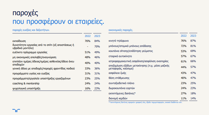 Σε ένα ανταγωνιστικό περιβάλλον εργασίας, με την εύρεση και προσέλκυση των ταλέντων να βρίσκεται στο προσκήνιο, οι εταιρείες προσφέρουν διάφορες παροχές στο ανθρώπινο δυναμικό τους, εστιάζοντας στην οικονομική ενίσχυση, την υιοθέτηση προγραμμάτων εκπαίδευσης, καθώς και τη δυνατότητα ευέλικτης μορφής απασχόλησης, εφαρμόζοντας είτε μοντέλο υβριδικής απασχόλησης είτε απομακρυσμένη εργασία.