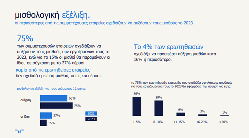 Εξετάζοντας εν γένει τη μισθολογική εξέλιξη, χαρακτηριστικό είναι το εύρημα της έρευνας που καταγράφει ότι το 70% των ερωτηθέντων εκτιμά ότι οι μισθοί στην εταιρεία τους είναι ίδιοι με τους αντίστοιχους που προσφέρουν οι ανταγωνιστές τους. Αισιοδοξία δημιουργεί το γεγονός ότι το 75% των εταιρειών σχεδιάζουν να αυξήσουν τους μισθούς των εργαζομένων τους το 2023, ενώ, μόλις για το 15%, οι μισθοί θα παραμείνουν στα ίδια επίπεδα, σε σύγκριση με το 27% που ήταν το προηγούμενο έτος.
