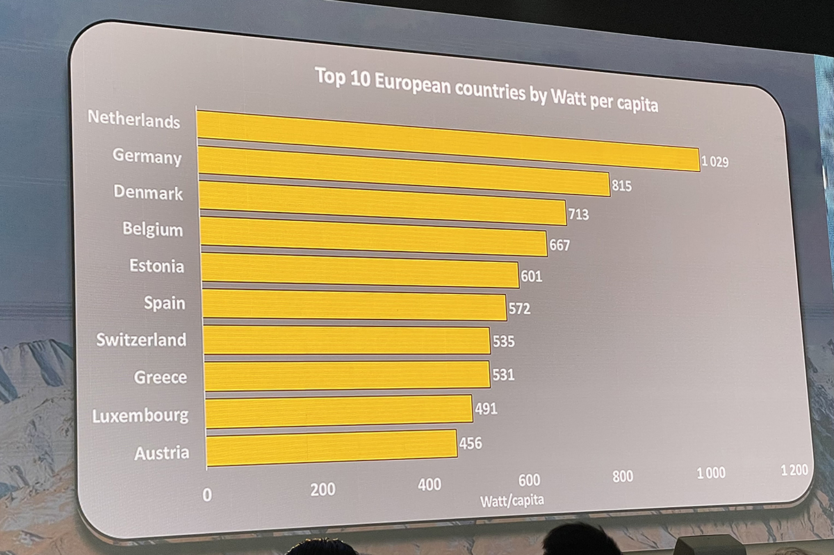 «Πρόκειται για έναν τομέα που αναπτύσσεται με ραγδαίους ρυθμούς. Βλέπουμε ότι ολοένα και περισσότερες εταιρείες υπογράφουν συμβόλαια και κινούνται προς αυτή την κατεύθυνση. Αυτή τη στιγμή πάνω από 10 ευρωπαϊκές αγορές κατέχουν πάνω από 1 GW στην Ευρώπη με πρώτη την Ισπανία, την Γερμανία και την Πολωνία. Σε ότι αφορά δε το Top 3 των χωρών με watt κατά κεφαλήν στο κομμάτι της ηλιακής ενέργειας, στην πρώτη θέση βρίσκεται η Ολλανδία και ακολουθούν η Γερμανία και η Δανία» ανέφερε ο κ. Acke.