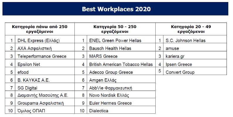 Στην έρευνα Best Workplaces 2020, η οποία διεξήχθη για 18η συνεχή χρονιά στη χώρα μας με την ακαδημαϊκή υποστήριξη του ALBA Graduate Business School, The American College of Greece, διακρίνονται 25 επιχειρήσεις, οι οποίες χωρίζονται σε τρεις κατηγορίες ανάλογα με τον αριθμό των εργαζομένων τους: