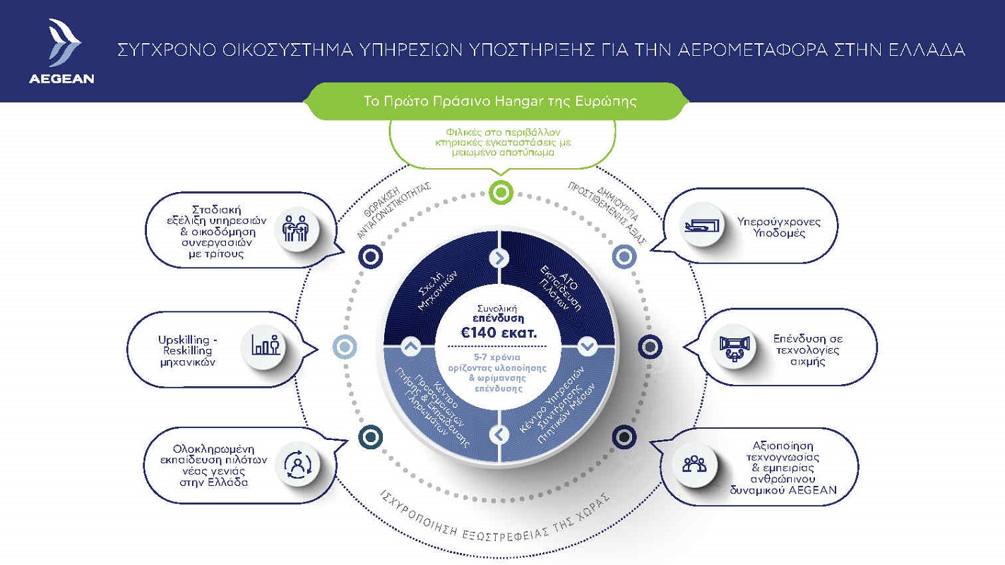 Πιστή στη δέσμευσή της για διαρκή εξέλιξη και ανάπτυξη, η AEGEAN προχωρά σε μια νέα επένδυση ύψους 140 εκατ. ευρώ για τη δημιουργία του πρώτου Κέντρου Υπηρεσιών Συντήρησης Πτητικών Μέσων, καθώς και του πρώτου Κέντρου Προσομοιωτών Πτήσεων και Εκπαίδευσης Πληρωμάτων στην Ελλάδα. Η επένδυση αυτή δημιουργεί νέα δυναμική προστιθεμένης αξίας, εξωστρέφειας και ανταγωνιστικότητας στην AEGEAN, αλλά και ευρύτερα στον κλάδο αερομεταφορών της χώρας. Με το μέγεθος της επένδυσης και τη χωρητικότητα που δημιουργείται, η εξυπηρέτηση των αναγκών υποστήριξης τρίτων εταιρειών αποτελεί πλέον κύριο επιχειρηματικό στόχο. Στην ωρίμανσή της (5-7 χρόνια) η επένδυση αυτή αναμένεται να δημιουργήσει 500 νέες άμεσες και συνολικά περισσότερες από 1.100 νέες άμεσες και έμμεσες θέσεις εργασίας υψηλών δεξιοτήτων, ενώ παράλληλα, σημαντικά εκτιμώνται ότι θα είναι και τα δημοσιονομικά οφέλη, καθώς αναμένονται φορολογικά έσοδα και εισφορές άνω των 400-450 εκατ. ευρώ κατά την διάρκεια της παραχώρησης.