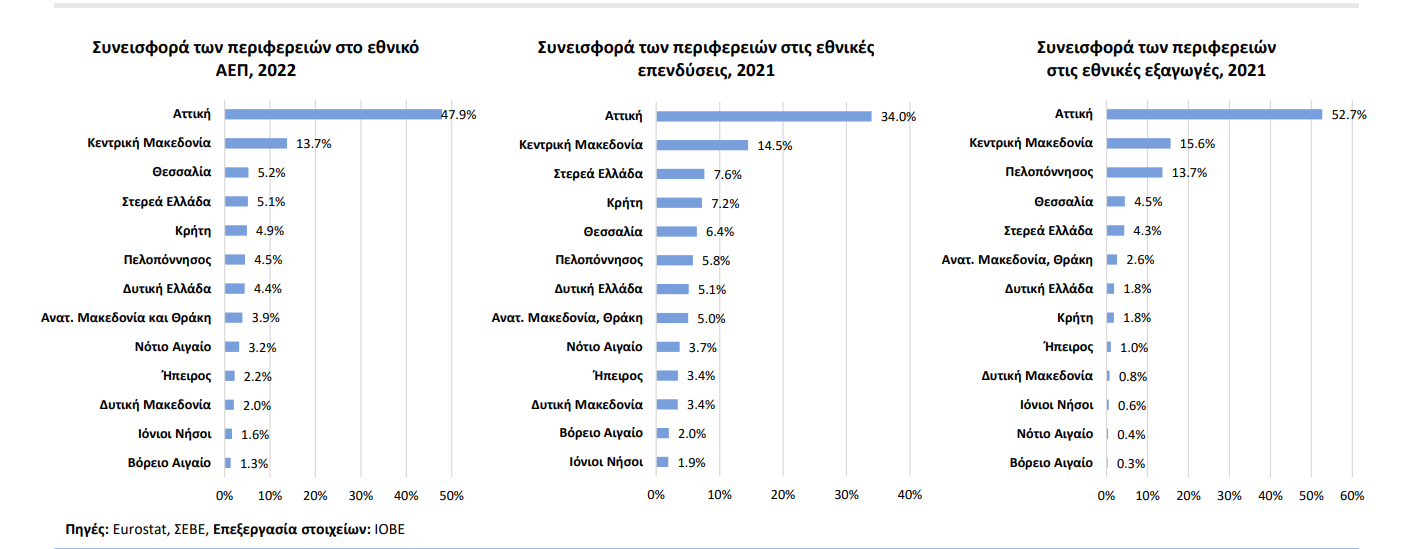 Σύμφωνα με αυτή, η συνεισφορά της Αττικής στο ελληνικό ΑΕΠ για το 2022 ανήλθε στο 47,9% όταν η δεύτερη περιφέρεια (η Κεντρική Μακεδονία) συνέβαλε στο 13,7% του ΑΕΠ.
