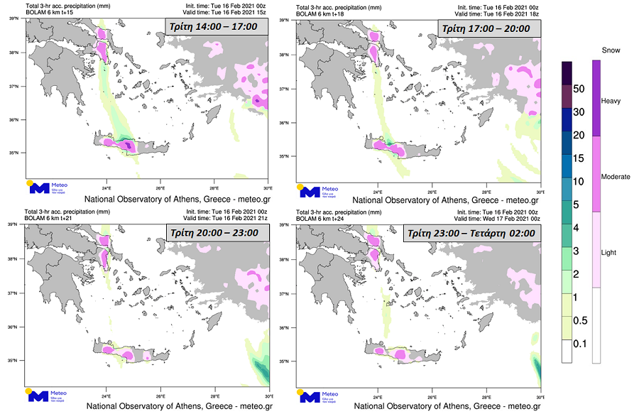 Πιο αναλυτικά, χιονοπτώσεις θα σημειωθούν στην Αττική, στην Εύβοια, στην Κρήτη και σε περιοχές μεγάλου υψομέτρου των Κυκλάδων, ενώ χιονόνερο ή χιόνι αναμένεται κατά τόπους στις Κυκλάδες και σε παράκτιες περιοχές της Κρήτης. Από το βράδυ της Τρίτης τα φαινόμενα θα περιοριστούν σταδιακά στην Κεντρική Εύβοια, στα βόρεια της Αττικής και στη Δυτική Κρήτη και έως το πρωί της Τετάρτης 17/2 θα σταματήσουν.