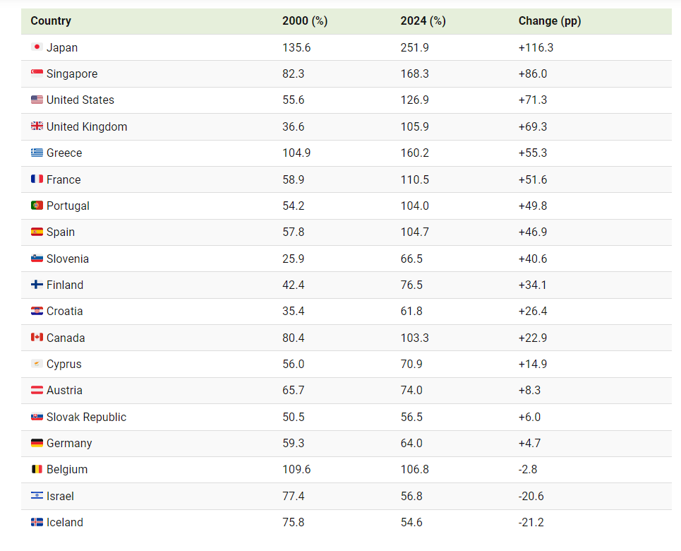 Η Ιαπωνία (+116%), η Σιγκαπούρη (+86%) και οι ΗΠΑ (+71%) αύξησαν το χρέος τους ως ποσοστό του ΑΕΠ περισσότερο από το 2000.
