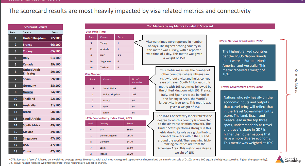 Η χώρα μας βρίσκεται στην 9η θέση μεταξύ 18 χωρών στη λίστα που κρίνει μια σειρά παράγοντας για τον τουριστικό κλάδο, όπως η βίζα, τα κυβερνητικά μέτρα για την προώθηση του τουρισμού, το τουριστικό brand, η ασφάλεια και ευκολία για τους ταξιδιώτες, η συνδεσιμότητα και ανάκαμψη από το πλήγμα που επέφερε στον παγκόσμιο τουρισμό η πανδημία του κορονοϊού.