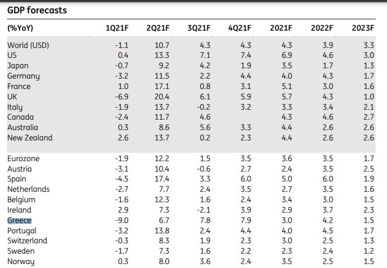 Το δεύτερο τρίμηνο η ανάπτυξη θα κινηθεί στο 6,7% όπως εκτιμά η ING και για το σύνολο του 2021 αναμένεται ανάπτυξη στην Ελλάδα της τάξεως του 3% ενώ το 2022 αναμένεται επιτάχυνση στο 4,2%.