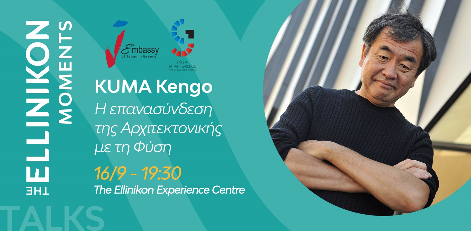 Η Πρεσβεία της Ιαπωνίας στην Ελλάδα σε συνεργασία με την LAMDA Development, στο πλαίσιο των δράσεων για το «2024: Έτος Πολιτισμού και Τουρισμού Ιαπωνίας – Ελλάδας» και της ενότητας “Talks” του θεσμού “The Ellinikon Moments”, υποδέχεται την Δευτέρα 16 Σεπτεμβρίου, για μια μοναδική ομιλία, τον διεθνούς φήμης αρχιτέκτονα KUMA Kengo. Ο διακεκριμένος Ιάπωνας αρχιτέκτονας θα μιλήσει στο τέταρτο “Talk” για τη διαχρονική προσπάθειά του να επανασυνδέσει την αρχιτεκτονική με το φυσικό περιβάλλον και να διατηρήσει τη συνέχεια μεταξύ φυσικού και κοινωνικού πλαισίου, χρησιμοποιώντας τοπικά υλικά και παραδοσιακά μοτίβα.