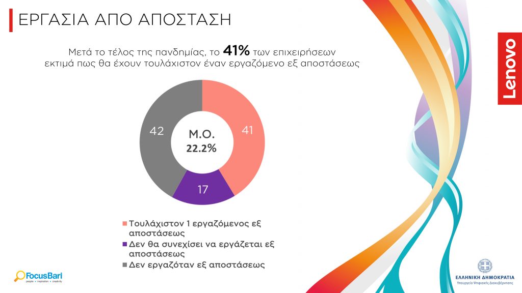 Σύμφωνα με έρευνα που εκπόνησε η Focus Bari για λογαριασμό της Lenovo, του κορυφαίου κατασκευαστή προσωπικών υπολογιστών παγκοσμίως, με τίτλο «Leading The Way Forward: Digital Transformation & Security in the Covid-19 era», το 41% των επιχειρήσεων που συμμετείχαν σε αυτή δήλωσε ότι και μετά το τέλος της πανδημίας θα έχει τουλάχιστον έναν εξ αποστάσεως υπάλληλο, ενώ θεωρεί ότι κατά μέσο όρο το ποσοστό αυτό θα φθάσει στο 22,2%. Αξίζει δε να επισημανθεί πως μόνο το 17% των εταιρειών δηλώνει πως δεν θα συνεχίσει να εφαρμόζει την εξ αποστάσεως εργασία.