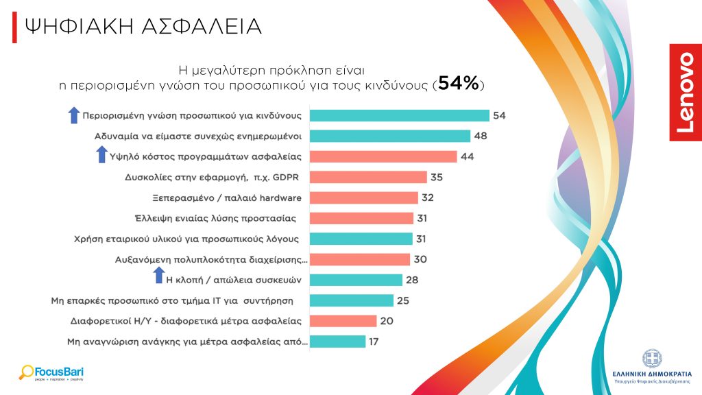Όσον αφορά τις μεγαλύτερες προκλήσεις σε επίπεδο κυβερνοασφάλειας, είναι η περιορισμένη γνώση του προσωπικού για τους κινδύνους (54%), η αδυναμία να είναι συνεχώς ενημερωμένοι στους πιθανούς κινδύνους οι ειδικοί στα συστήματα ασφαλείας (48%), αλλά και το υψηλό κόστος των σχετικών προγραμμάτων (44%).