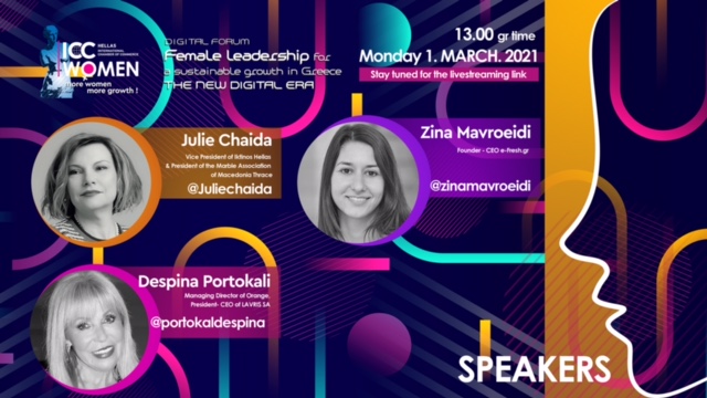Στo νέο virtual event την Δευτέρα 1/3/2021 στις 13:00 με τίτλο: «H Γυναικεία Ηγεσία για Βιώσιμη Ανάπτυξη στην Ελλάδα – Η νέα Ψηφιακή Εποχή» θα γνωρίσουμε γυναίκες – πρότυπα δύναμης και εξέλιξης όπως οι: Τζούλη Χαϊδά, της εισηγμένης στο ΧΑ εταιρείας μαρμάρων ΙΚΤΙΝΟΣ & εξαγωγές σε 90 χώρες, Ζήνα Μαυροειδή δημιουργός του e-fresh του online σούπερ μάρκετ, Δέσποινα Πορτοκάλη ιδρύτρια της διαφημιστικής εταιρείας Orange Advertising και η Ελληνο-Καναδέζα Μελίσσα Καργιαννάκη, μία από τις 100 ισχυρότερες γυναίκες του Καναδά.