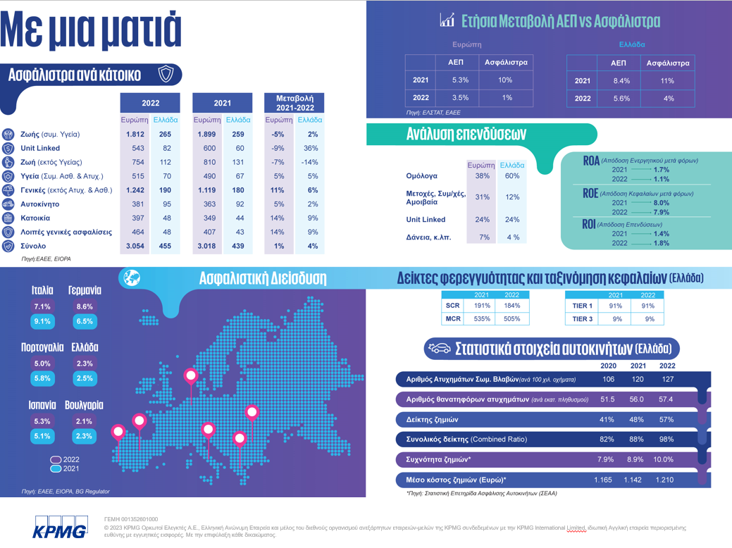 Για 13η συναπτή χρονιά, η KPMG στην Ελλάδα, προχώρησε στη δημοσίευση της Ετήσιας Έκθεσης για την Ασφαλιστική Αγορά για το 2023, ένα εξαιρετικά χρήσιμο εργαλείο ανάλυσης της χρηματοοικονομικής κατάστασης, των αποδόσεων και προοπτικών των ασφαλιστικών εταιρειών αλλά και συνολικά του ασφαλιστικού κλάδου στην Ελλάδα.
