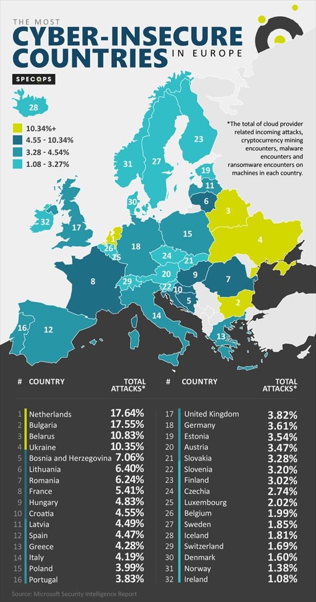 Τα δεδομένα από το Microsoft Security Intelligence Report πιστοποιούν ότι η Ελλάδα βρίσκεται στη 13η θέση της κατάταξης 32 χωρών της Ευρώπης που είναι πιο πιθανό να πληγούν από ποικίλες κυβερνοαπειλές.