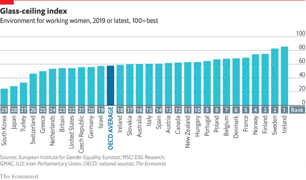 Για να σηματοδοτήσει τη φετινή Παγκόσμια Ημέρα της Γυναίκας, το Economist ανανέωσε την έρευνα πάνω στο φαινόμενο της γυάλινης οροφής, που κατατάσσει 29 χώρες βάσει δέκα δεικτών ισότητας μεταξύ ανδρών και γυναικών στον χώρο εργασίας: ακαδημαϊκή επιτυχία, συμμετοχή στο εργατικό δυναμικό, μισθό, κόστος της κηδεμονίας, δικαιώματα μητρότητας και πατρότητας, αιτήσεις σε σχολές διοίκησης επιχειρήσεων, και αντιπροσώπευση σε υψηλά ιστάμενες θέσεις (θέσεις στη διοίκηση, σε διοικητικά συμβούλια και στη Βουλή).
