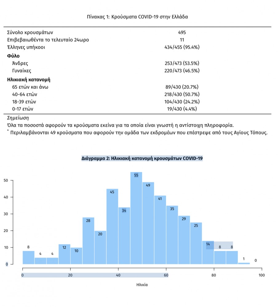 Από το σύνολο των επιβεβαιωμένων κρουσμάτων στην Ελλάδα το 95.4 % αφορά Έλληνες (455 στο σύνολο) και άλλοι 40 θετικοί στον κορωνοϊό είναι αλλοδαποί που ζουν στην Ελλάδα.