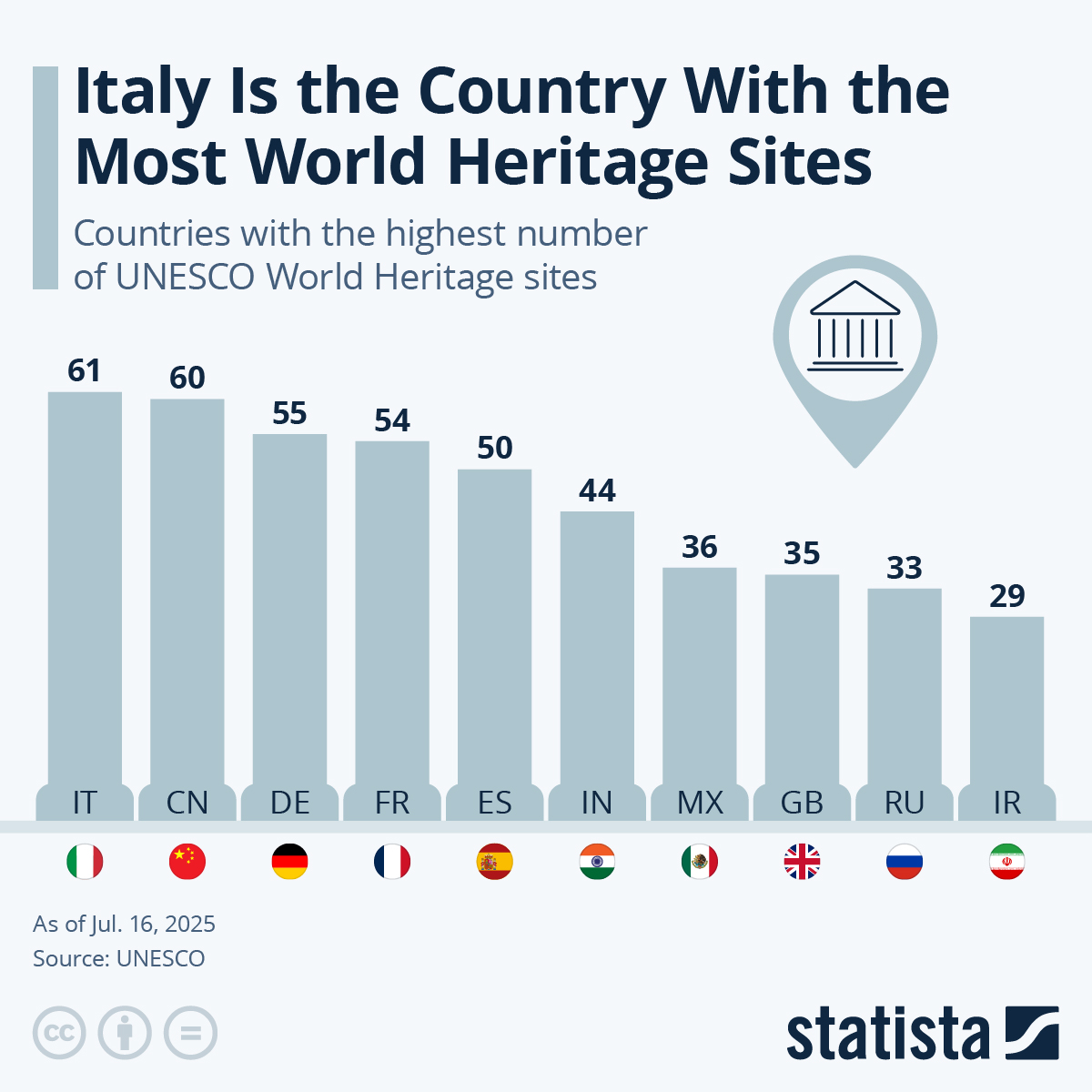 Η Ιταλία εξακολουθεί να κατέχει την πρωτοκαθεδρία παγκοσμίως, με συνολικά 61 τοποθεσίες, συμπεριλαμβανομένης της φετινής προσθήκης των “domus de janas” ή αλλιώς «νεραϊδόσπιτα» — μια ομάδα λαξευμένων τάφων στη Σαρδηνία, οι οποίοι χρονολογούνται από την 5η έως την 3η χιλιετία π.Χ.