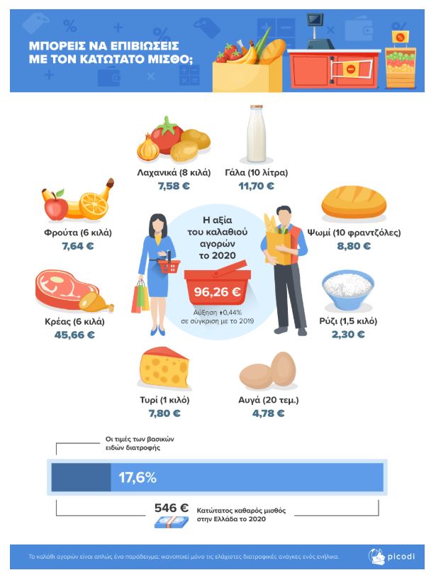 Σύμφωνα με την έρευνα της picodi.com η συνολική τιμή των βασικών προϊόντων διατροφής ανέρχεται σε 96,26 ευρώ, κατά 0,44% αυξημένη από ό, τι το προηγούμενο έτος ενώ το βασικό καλάθι αγορών αντιστοιχεί στο 17,6% του κατώτατου καθαρού μισθού.